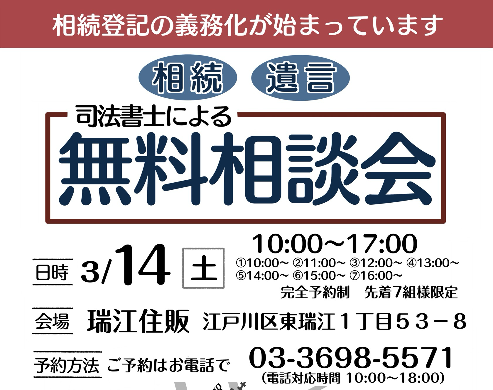 未分類 2024.07.182026.02.16 3/14 瑞江住販 無料相談会 専用申し込みフォーム 必須ご相談内容 相続遺言その他 必須お名前 必須希望時間 11:30~15:30~ 必須メールアドレス 必須お電話番号 必須メッセージ本文